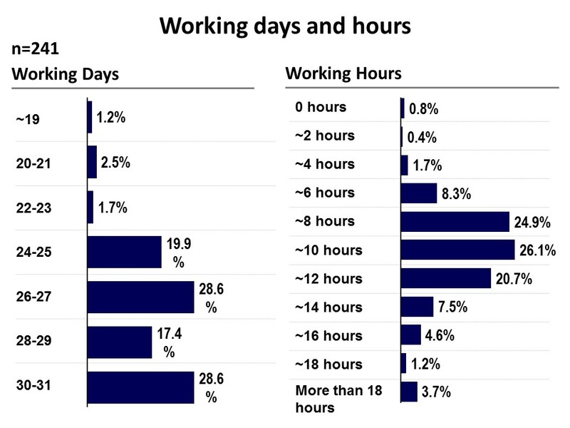 8-10 working hours per day is a common norm with most Indian doctors. About 25% doctors reported 10 hours of daily working while another 25% doctors reported 8 hours of daily working. 20% of the respondents also reported that they worked approximately 12 hours a day. Working without weekly breaks is a common trend among Indian doctors. Close to 30 % of the respondents reported that they worked for all the days of a month. Another 28% of the doctors responded saying they work for at least 27 to 28 days a month.