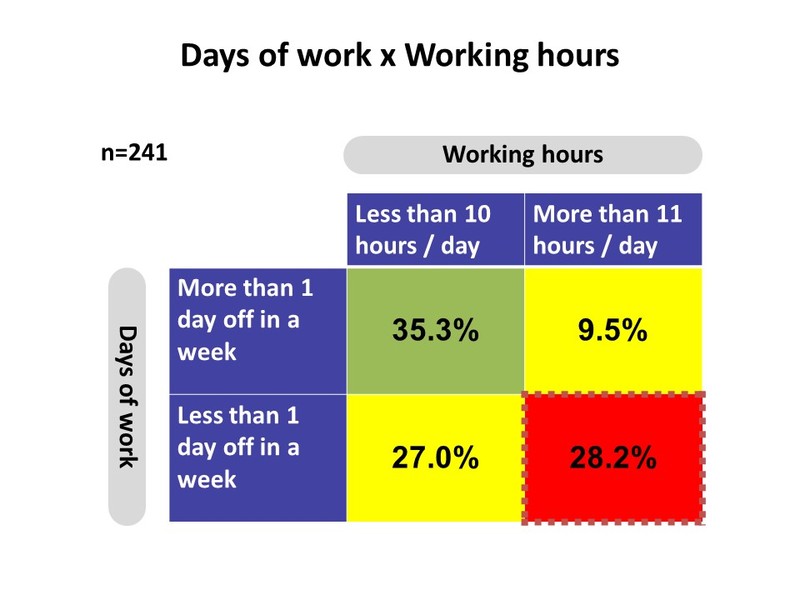 To analyse, over one fourth of the doctors work over 11 hours daily without weekends off.