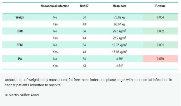During a mean hospital stay of 13.9 days, 43 (40.2%) patients developed a NI, which were primarily respiratory tract infections in 26 patients. Patients developing a NI had significantly lower weight, BMI and FFMI than the overall patient cohort (p <0.05 all comparisons), but PA was not lower.
